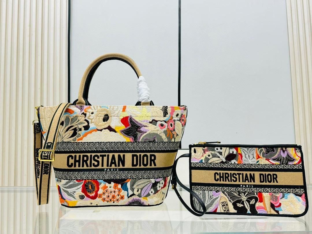 The new Chapeau basket bag presented at the Cruise 2024 Fashion Show is characterized by its feminine silhouette that combines functionality and elegance. The bag is embroidered throughout with the multicolored Brocart Butterfly motif, which combines the collection’s typical butterflies in opulent colors with the Maison’s savoir-faire. A Christian Dior Paris lettering on the front complements the design. A tonal, removable zippered pouch and an adjustable and removable embroidered strap complete the spacious bag that can be carried by hand, over the shoulder or as a crossbody bag. Christian Dior Paris lettering on the front Removable pouch with zipper Adjustable and removable shoulder strap with embroidery Includes protective bag