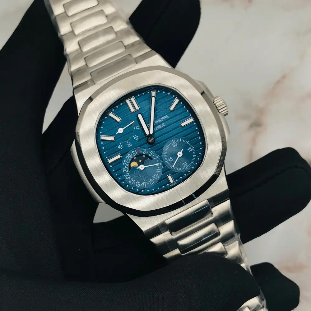 Discover elegance in every detail with the Patek Philippe Nautilus Moon Phase. Its blue striped dial exudes sophistication, set in a durable steel case.