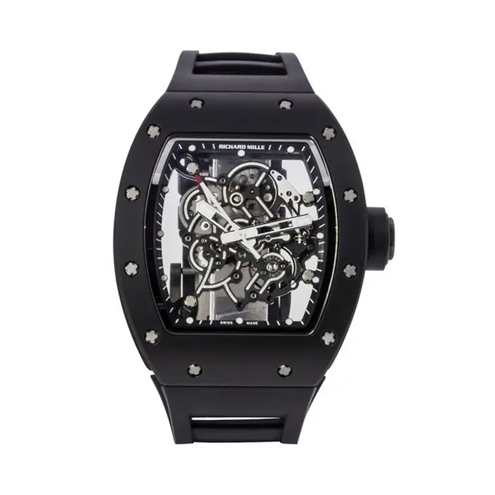 The Richard Mille RM055 Replica Bubba Watson Black Ceramic is a stunning homage to the iconic luxury sports watch. Crafted with super master quality, this replica features a sleek black ceramic case that offers durability and a premium feel. The intricate skeletonized dial showcases the complex movement, mirroring the high-end design of the original. Designed for precision and style, it includes a rubber strap for comfort and sporty elegance. Perfect for watch enthusiasts who desire the Richard Mille aesthetic without the hefty price tag.